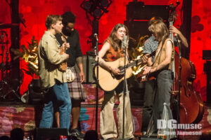 The three band members, Satterlee, bassist Tarka Layman, and keys player Lucas Pettee, are down from the slightly raised stage and are lined up alongside the sisters, gathered around an old-time recording studio mic. Layman is now on upright bass, Pettee has swapped to a mandolin, and Satterlee, well, Satterlee is out from behind his kit, and he’s in a kilt! Rebecca had touched on his love for Scotland earlier, but after a bit of Insta detective work, it turns out that he has Scottish heritage as his 7th-great-grandfather was a chap called Daniel MacPherson and was kidnapped from the highlands and brought to America. Gotta love Insta.