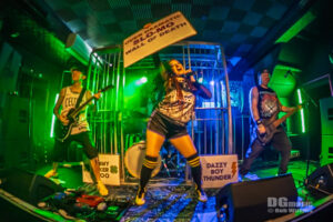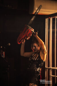 Psychoberrie is charismatic and grabs attention with ease. Joining her at the front, Rico Rameres glowers and snarls, as well as adding a layer of depth and gravel to the vocals. Wolfy Huntsman’s bass shakes the room along with most of the student flats in the vicinity, and Doktor Von Stottenstein rarely takes the limelight, but when he does, it is to throw out a searing solo before returning to the side of the diminutive space. Marshall Kadavers cuts a gloriously deranged figure at the back and controls the ambient sound as well as some thundering drum work, and Nurse Betty somehow leaves you more than a little chilled!